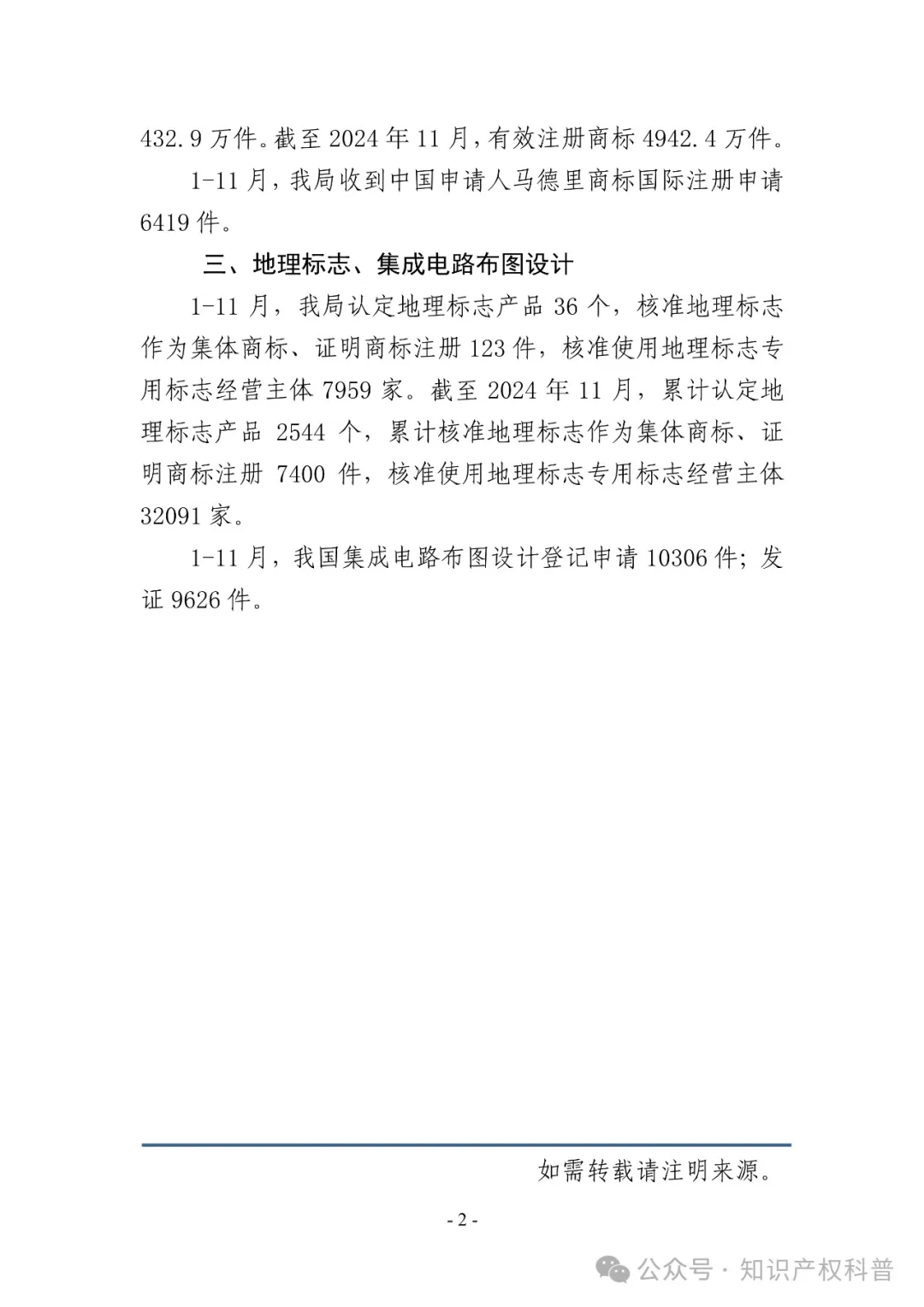 1-11月,我国商标申请量为640.0万件;商标注册量为432.9万件。截至2024年11月,有效注册商标4942.4万件。1-11月,我局收到中国申请人马德里商标国际注册申请6419件。